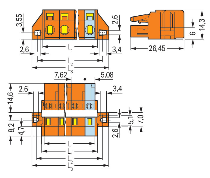 Spina femmina per 1 conduttore. CAGE CLAMP®. 2,5 mm2. Passo pin 7,62 mm. 6 poli. collare di fissaggio. 2,50 mm2. arancione