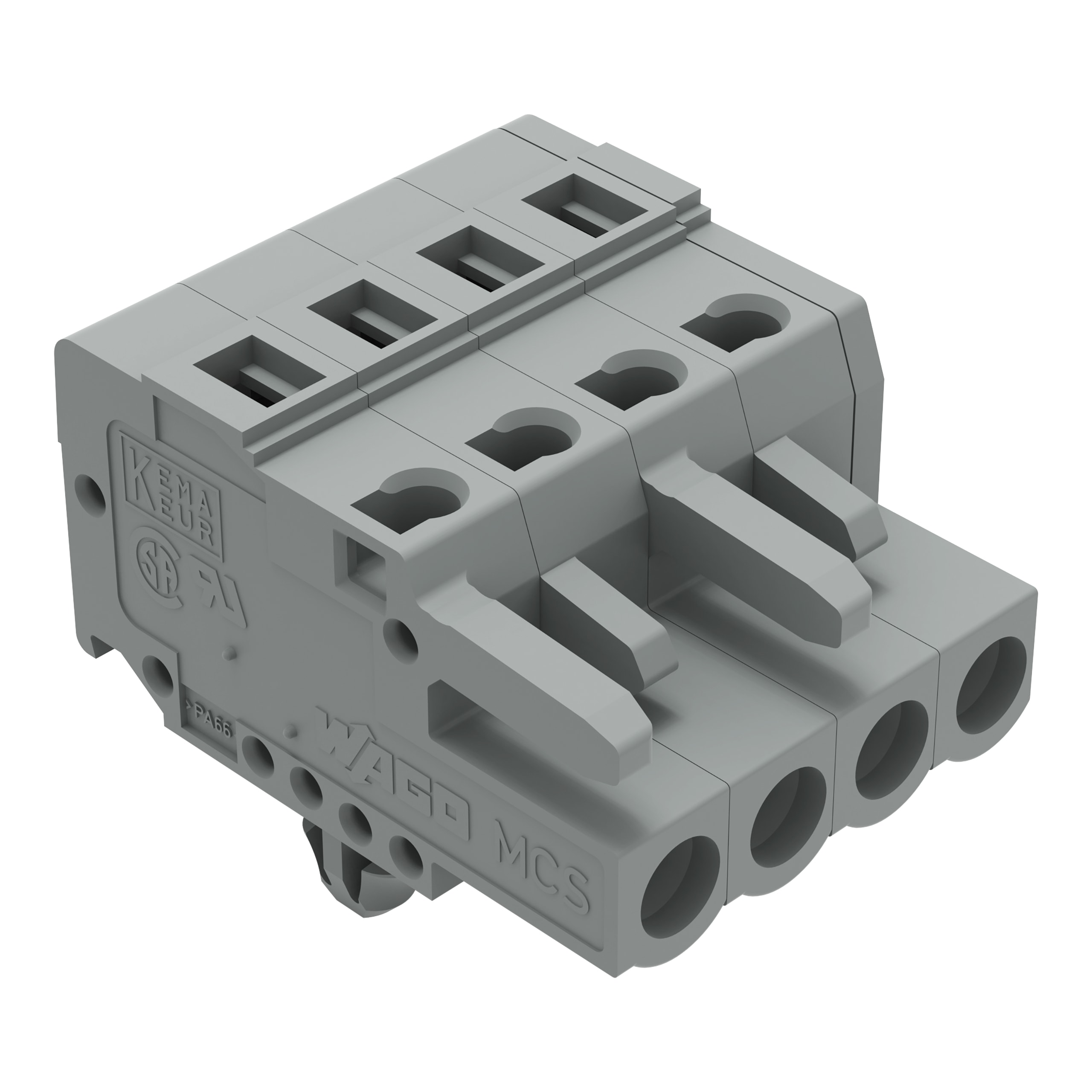 Spina femmina per 1 conduttore. CAGE CLAMP®. 2,5 mm2. Passo pin 5 mm. 4 poli. Piedi di fissaggio a scatto. 2,50 mm2. grigio