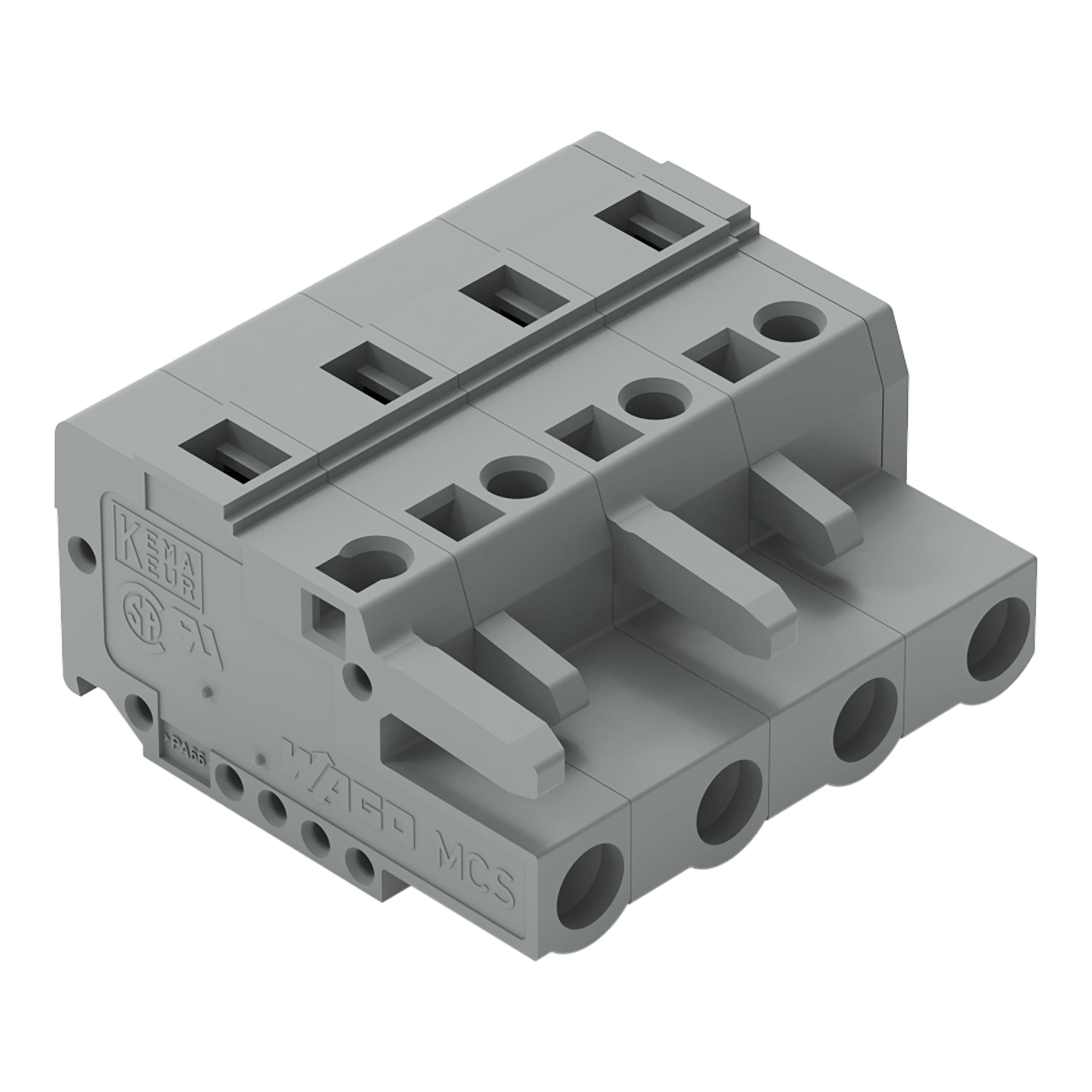 Spina femmina per 1 conduttore. CAGE CLAMP®. 2,5 mm2. Passo pin 7,5 mm. 4 poli. 2,50 mm2. grigio
