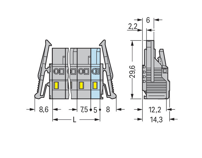 Spina femmina per 1 conduttore. CAGE CLAMP®. 2,5 mm2. Passo pin 7,5 mm. 11 poli. Leve di bloccaggio laterali. 2,50 mm2. grigio