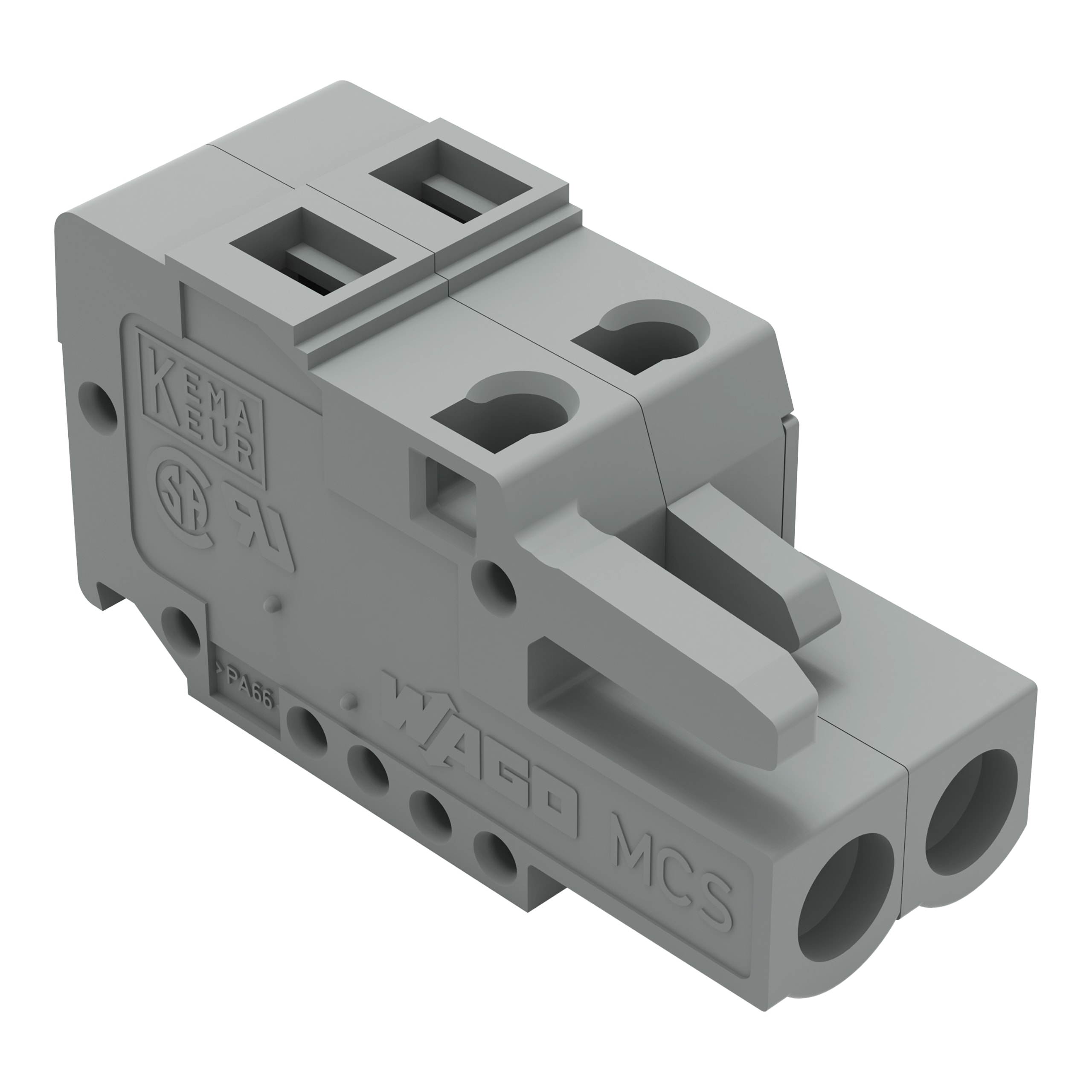 Spina femmina per 1 conduttore. CAGE CLAMP®. 2,5 mm2. Passo pin 5 mm. 2 poli. con piastra terminale integrata. 2,50 mm2. grigio