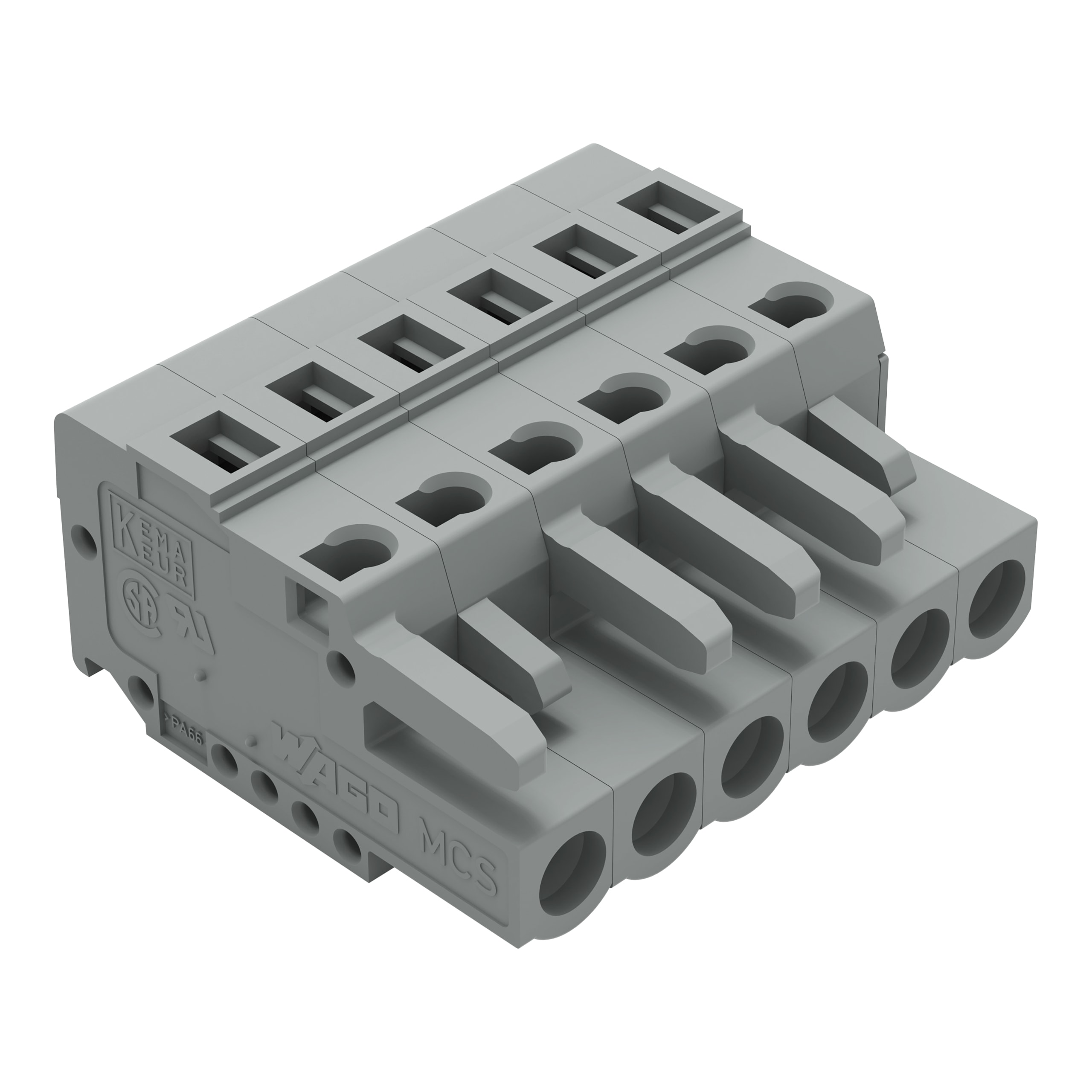 Spina femmina per 1 conduttore. CAGE CLAMP®. 2,5 mm2. Passo pin 5 mm. 6 poli. con piastra terminale integrata. 2,50 mm2. grigio