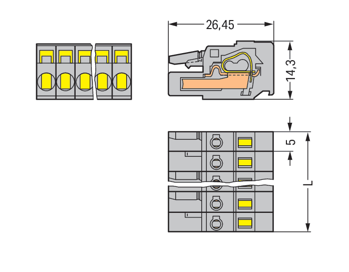 Spina femmina per 1 conduttore. CAGE CLAMP®. 2,5 mm2. Passo pin 5 mm. 8 poli. con piastra terminale integrata. 2,50 mm2. grigio
