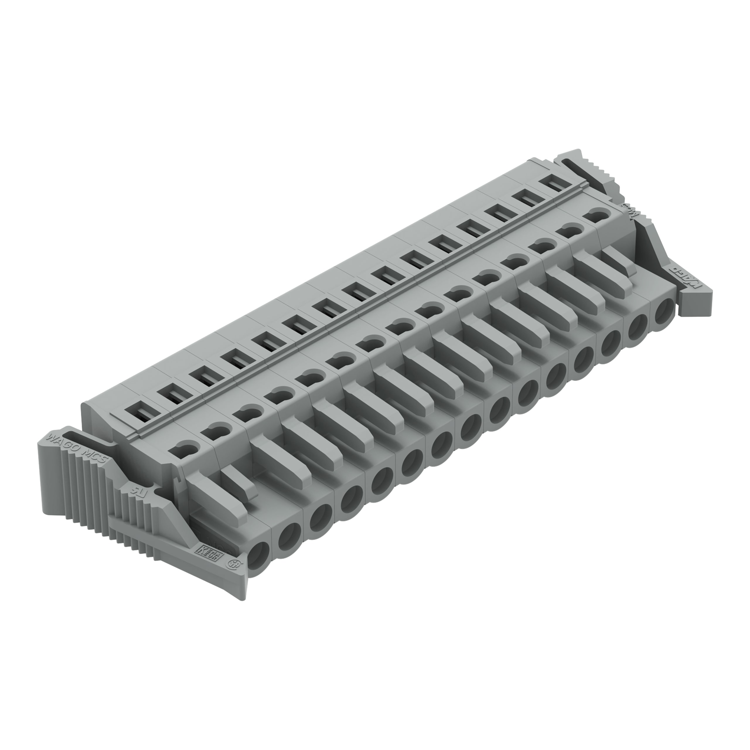 Spina femmina per 1 conduttore. CAGE CLAMP®. 2,5 mm2. Passo pin 5 mm. 15 poli. Leve di bloccaggio laterali. 2,50 mm2. grigio