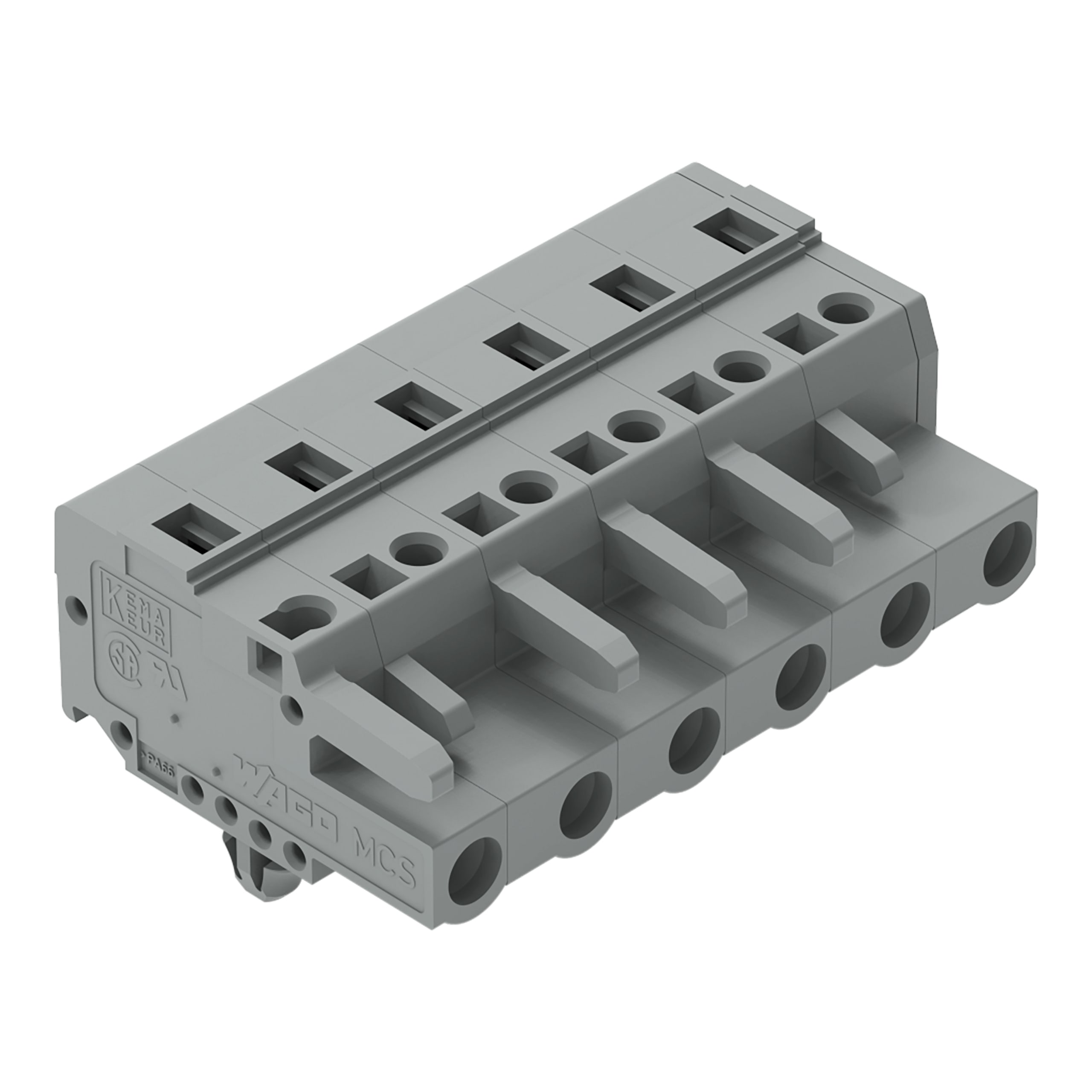 Spina femmina per 1 conduttore. CAGE CLAMP®. 2,5 mm2. Passo pin 7,5 mm. 6 poli. Piedi di fissaggio a scatto. 2,50 mm2. grigio