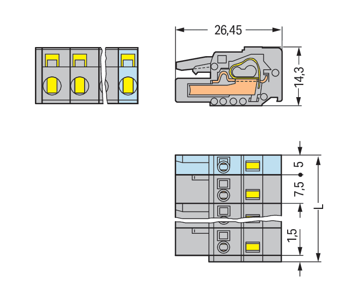 Spina femmina per 1 conduttore. CAGE CLAMP®. 2,5 mm2. Passo pin 7,5 mm. 10 poli. 2,50 mm2. grigio
