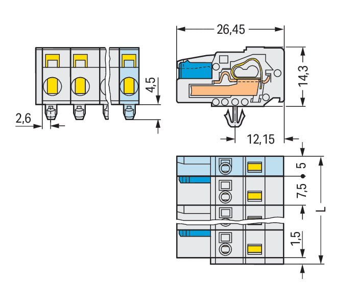 Spina femmina per 1 conduttore. CAGE CLAMP®. 2,5 mm2. Passo pin 7,5 mm. 12 poli. Protetto al 100% contro l'inversione di polarità. Piedi di fissaggio a scatto. 2,50 mm2. grigio chiaro