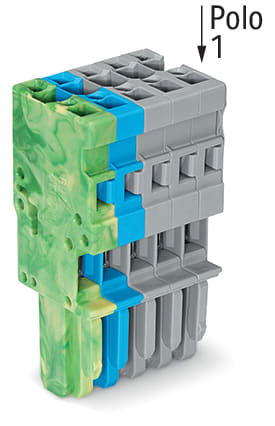 Spina femmina per 1 conduttore. CAGE CLAMP®. 4 mm2. Passo pin 5 mm. 5 poli. Pin di codifica. 4,00 mm2. grigio, blu, giallo-verde