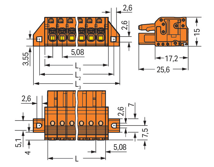 Spina femmina per 1 conduttore. pulsante. Push-in CAGE CLAMP®. 2,5 mm2. Passo pin 5,08 mm. 16 poli. collare di fissaggio. 2,50 mm2. arancione