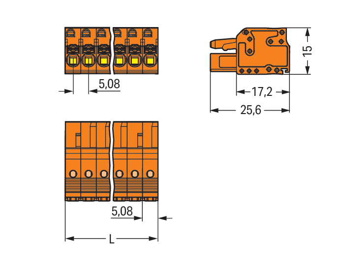Spina femmina per 1 conduttore. pulsante. Push-in CAGE CLAMP®. 2,5 mm2. Passo pin 5,08 mm. 2 poli. con piastra terminale integrata. 2,50 mm2. arancione
