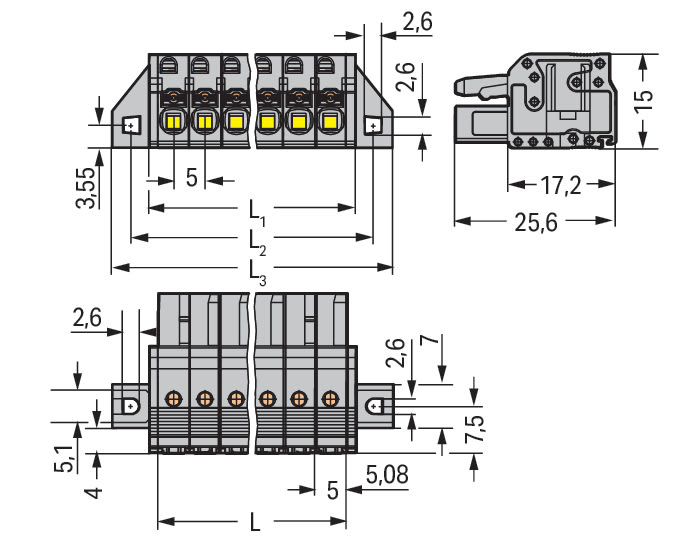 Spina femmina per 1 conduttore. pulsante. Push-in CAGE CLAMP®. 2,5 mm2. Passo pin 5 mm. 12 poli. collare di fissaggio. 2,50 mm2. grigio