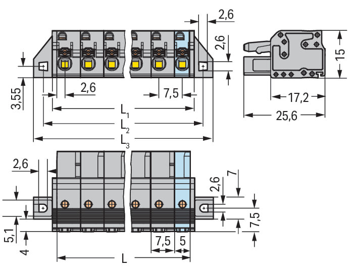 Spina femmina per 1 conduttore. pulsante. Push-in CAGE CLAMP®. 2,5 mm2. Passo pin 7,5 mm. 13 poli. collare di fissaggio. 2,50 mm2. grigio
