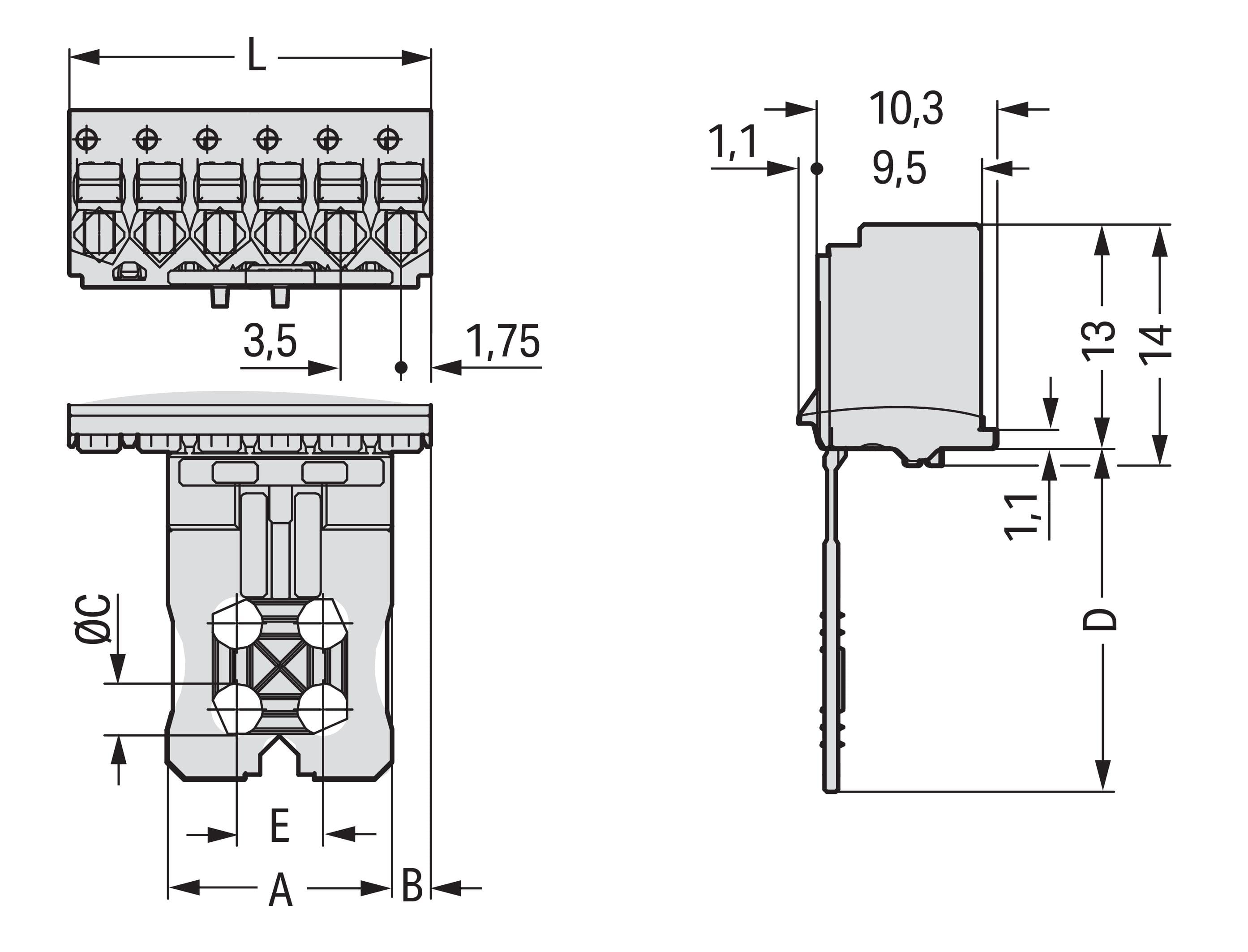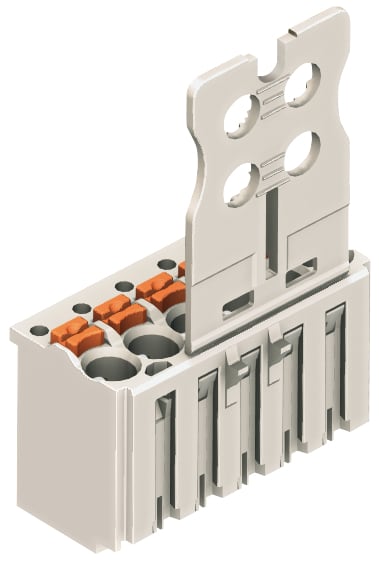 Spina femmina per 1 conduttore. pulsante. Push-in CAGE CLAMP®. 1,5 mm2. Passo pin 3,5 mm. 6 poli. Piastra di fermo. 1,50 mm2. grigio chiaro