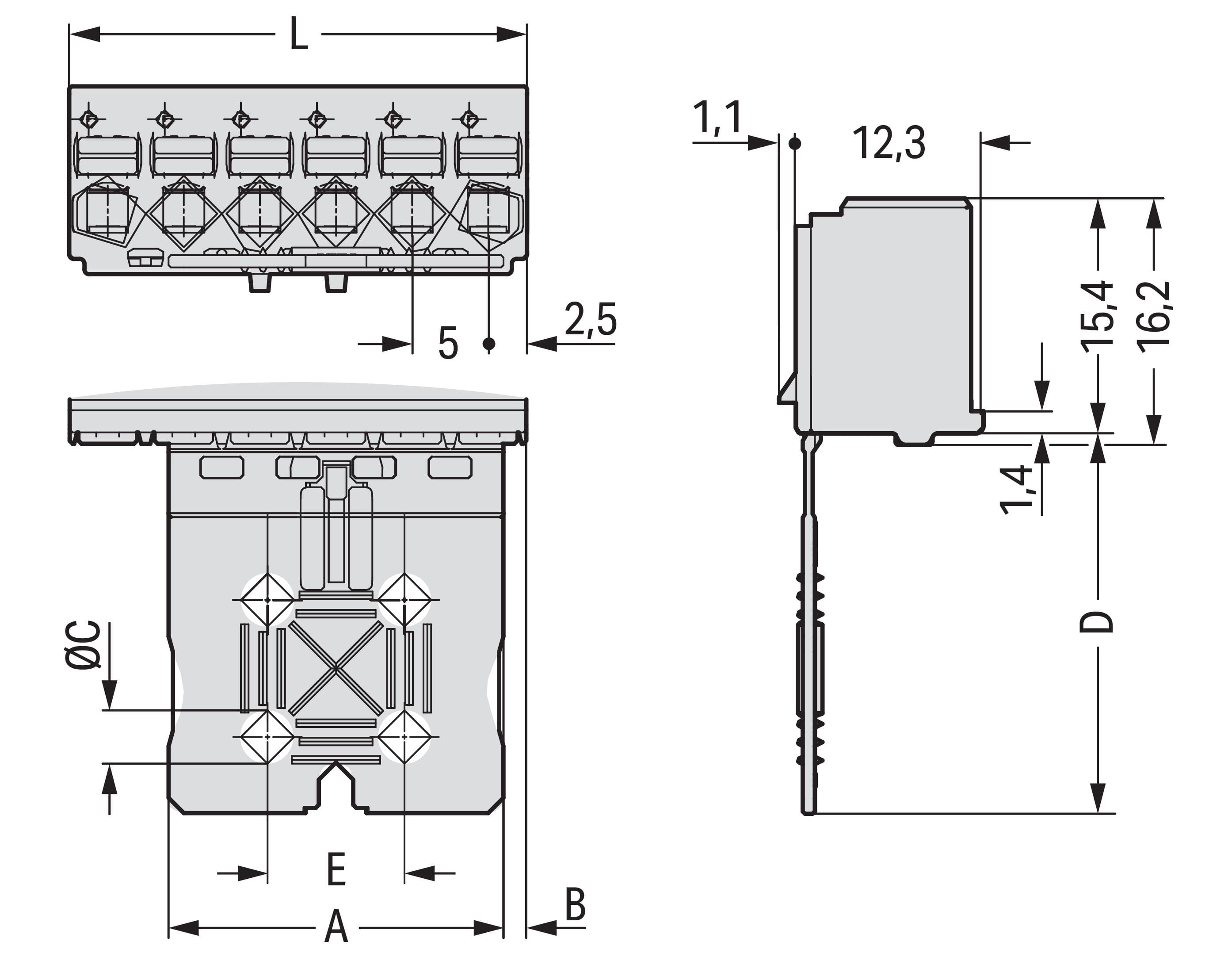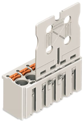 Spina femmina per 1 conduttore. pulsante. Push-in CAGE CLAMP®. 2,5 mm2. Passo pin 5 mm. 2 poli. Piastra di fermo. 2,50 mm2. grigio chiaro