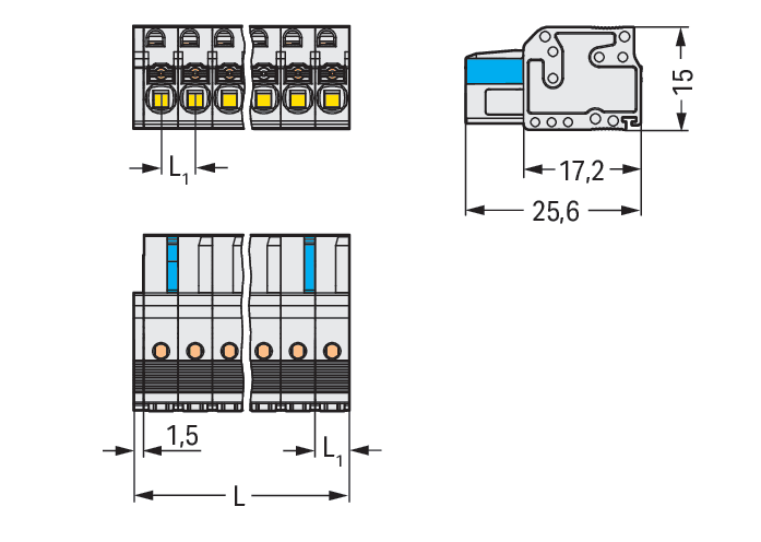Spina femmina per 1 conduttore. pulsante. Push-in CAGE CLAMP®. 2,5 mm2. Passo pin 5 mm. 15 poli. Protetto al 100% contro l'inversione di polarità. 2,50 mm2. grigio chiaro
