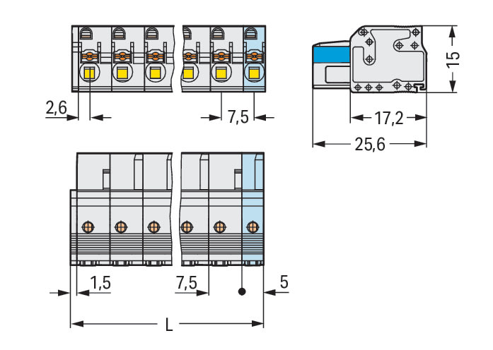Spina femmina per 1 conduttore. pulsante. Push-in CAGE CLAMP®. 2,5 mm2. Passo pin 7,5 mm. 3 poli. Protetto al 100% contro l'inversione di polarità. 2,50 mm2. grigio chiaro