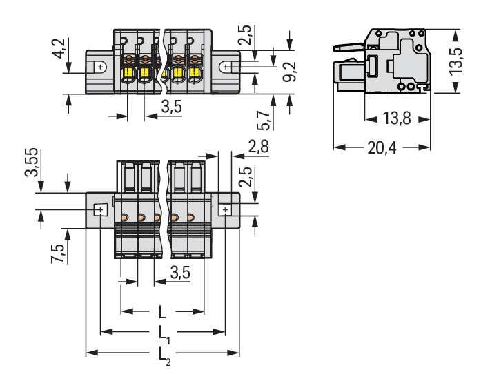 Spina femmina per 1 conduttore. pulsante. Push-in CAGE CLAMP®. 1,5 mm2. Passo pin 3,5 mm. 4 poli. Protetto al 100% contro l'inversione di polarità. collare di fissaggio. 1,50 mm2. grigio chiaro