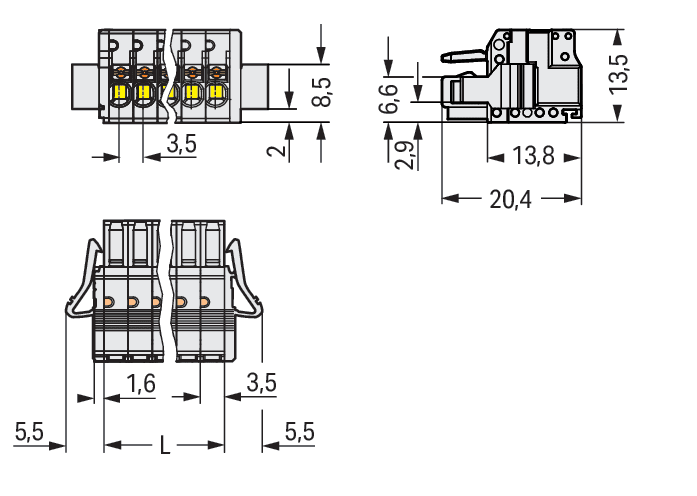Spina femmina per 1 conduttore. pulsante. Push-in CAGE CLAMP®. 1,5 mm2. Passo pin 3,5 mm. 10 poli. Protetto al 100% contro l'inversione di polarità. Leve di bloccaggio laterali. 1,50 mm2. grigio chiaro