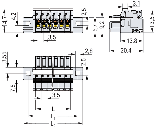 Spina femmina per 1 conduttore. pulsante. Push-in CAGE CLAMP®. 1,5 mm2. Passo pin 3,5 mm. 24 poli. Protetto al 100% contro l'inversione di polarità. collare di fissaggio. 1,50 mm2. grigio chiaro