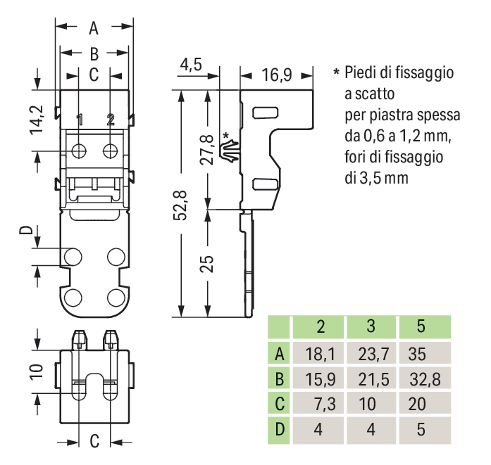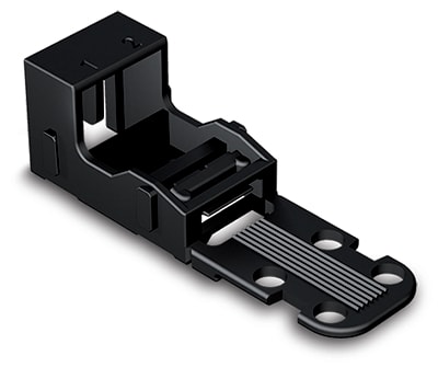 Supporto di montaggio. per morsetti per 2 conduttori. Serie 221 - 4 mm2. con piede di fissaggio a scatto per montaggio orizzontale. nero