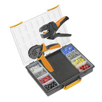 Cassetta con assortimento dotata di pinza crimpatrice, utensile spellafili e terminali per il taglio, la spellatura e la crimpatura. L\'assortimento ben ordinato aiuta a minimizzare la ricerca e le tempistiche di preparazione.