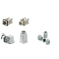 Set connettore a innesto industriale, composto da inserto, custodia e pressacavo.