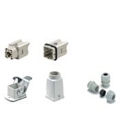 Set connettore a innesto industriale, composto da inserto, custodia e pressacavo.