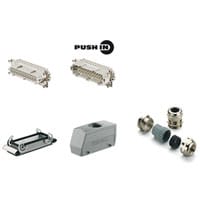Set connettore a innesto industriale, composto da inserto, custodia e pressacavo.