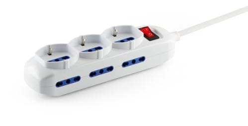 ALPHA ELETTRONICA - Multipresa con 3 prese Universali Italia P40 e 6 Italia bipasso - Interruttore - Cavo 1,5m - Spina 16A a 90° - Bianca