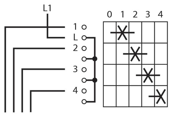EATON INDUSTRIES - Interruttori a gradini, T0, 20 A, montaggio a incasso, 2 Unità costruttiva/e, Contatti: 4, 45 °, permanente, con posizione 0, 0-4, numero di progettazione T0-2-15025/E.