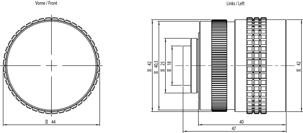 mini-obiettivo 8,5 mm, 1: 1,5 con distanza focale fissa, apertura diaframma e fuoco regolabile D=42mm, L=47mm; non utilizzabile con illuminatori ad anello interni utilizzabile.