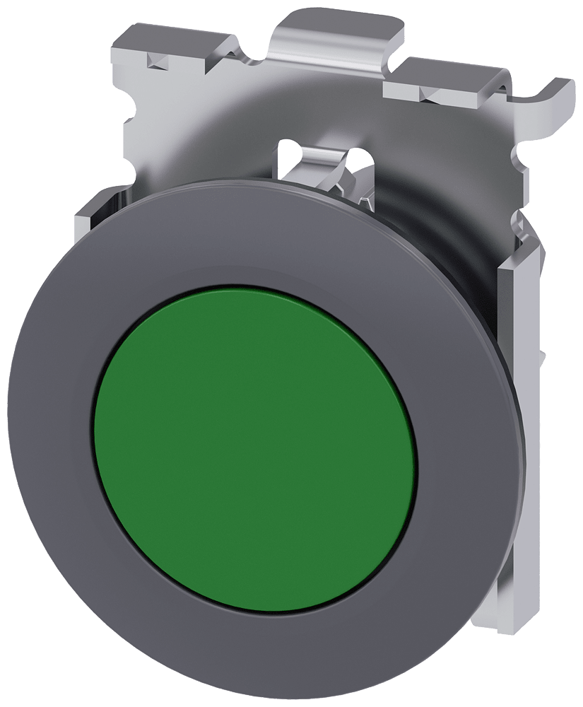 pulsante, 30 mm, rotondo, in metallo, opaco, verde, anello frontale per montaggio piatto, ad impulso Pulsante SIRIUS ACT per la commutazione e il comando di utilizzatori elettrici. Siemens offre, sotto il nome commerciale SIRIUS ACT, un portfolio esclusivo di dispositivi di comando e segnalazione con omologazioni di prodotto per il mercato mondiale in tre moderne serie di design in robusto metallo puro e plastica pregiata.L'innovativo concetto di innesto a scatto semplifica talmente il montaggio che per eseguirlo basta una sola mano e non servono attrezzi speciali. Per i fori di montaggio sono sufficienti semplici fori non scanalati, essendo già integrata una protezione antirotazione al 100 %.Grazie al grado di protezione elevato i robusti apparecchi sono adatti all'impiego industriale e in ambiente esterno. È persino possibile la pulizia con getto ad alta pressione. Né polvere, né oli, né liscivia possono comprometterne il funzionamento affidabile.Oltre che con il cablaggio standard, gli apparecchi possono essere collegati al controllore anche tramite PROFINET, AS-Interface oppure IO-Link. Potete così ridurre il vostro onere di cablaggio, minimizzare le fonti di errore e ottenere maggiore flessibilità.Il configuratore online grafico supporta in modo confortevole la scelta e l'ordinazione di singoli apparecchi, pulsantiere e iscrizioni. È disponibile una documentazione completa (ad es. manuale, dati 3D, schema di collegamento). Esecuzioni fornibili: più colori, luminoso/non luminoso, con/senza iscrizione, comando permanente/ad impulso, diverse altezze di bottone e ghiera. Avvertenza: Apparecchio singolo, supporti e moduli devono essere ordinati separatamente. SIRIUS ACT - Performance in Action nel comando e nella segnalazione. Semplici da montare, altamente performanti, semplicemente perfetti.