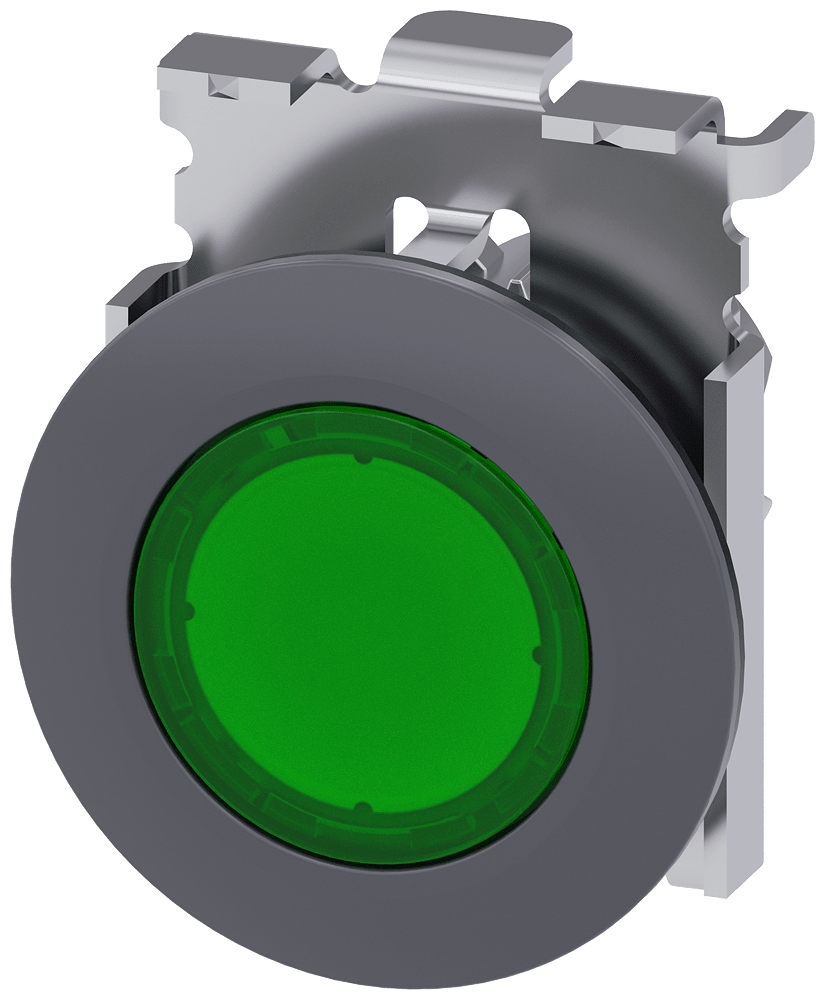 pulsante luminoso, 30 mm, rotondo, in metallo, opaco, verde, anello frontale per montaggio piatto, ad impulso Pulsanti luminosi SIRIUS ACT per la commutazione e il comando di utilizzatori elettrici. Siemens offre, sotto il nome commerciale SIRIUS ACT, un portfolio esclusivo di dispositivi di comando e segnalazione con omologazioni di prodotto per il mercato mondiale in tre moderne serie di design in robusto metallo puro e plastica pregiata.L'innovativo concetto di innesto a scatto semplifica talmente il montaggio che per eseguirlo basta una sola mano e non servono attrezzi speciali. Per i fori di montaggio sono sufficienti semplici fori non scanalati, essendo già integrata una protezione antirotazione al 100 %.Grazie al grado di protezione elevato i robusti apparecchi sono adatti all'impiego industriale e in ambiente esterno. È persino possibile la pulizia con getto ad alta pressione. Né polvere, né oli, né liscivia possono comprometterne il funzionamento affidabile.Oltre che con il cablaggio standard, gli apparecchi possono essere collegati al controllore anche tramite PROFINET, AS-Interface oppure IO-Link. Potete così ridurre il vostro onere di cablaggio, minimizzare le fonti di errore e ottenere maggiore flessibilità.Il configuratore online grafico supporta in modo confortevole la scelta e l'ordinazione di singoli apparecchi, pulsantiere e iscrizioni. È disponibile una documentazione completa (ad es. manuale, dati 3D, schema di collegamento). Esecuzioni fornibili: più colori, luminoso/non luminoso, con/senza iscrizione, comando permanente/ad impulso, diverse altezze di bottone e ghiera. Avvertenza: Apparecchio singolo, supporti e moduli devono essere ordinati separatamente. SIRIUS ACT - Performance in Action nel comando e nella segnalazione. Semplici da montare, altamente performanti, semplicemente perfetti.